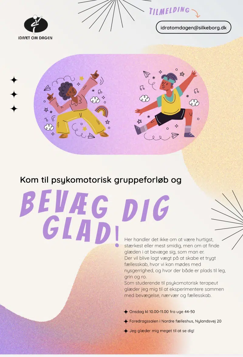 Bevæg dig glad? er nyt Psykomotorisk holdtrænings forløb over 8 uger med opstart i uge 44 - læs mere her: Bevægdigglad-2025.pdf